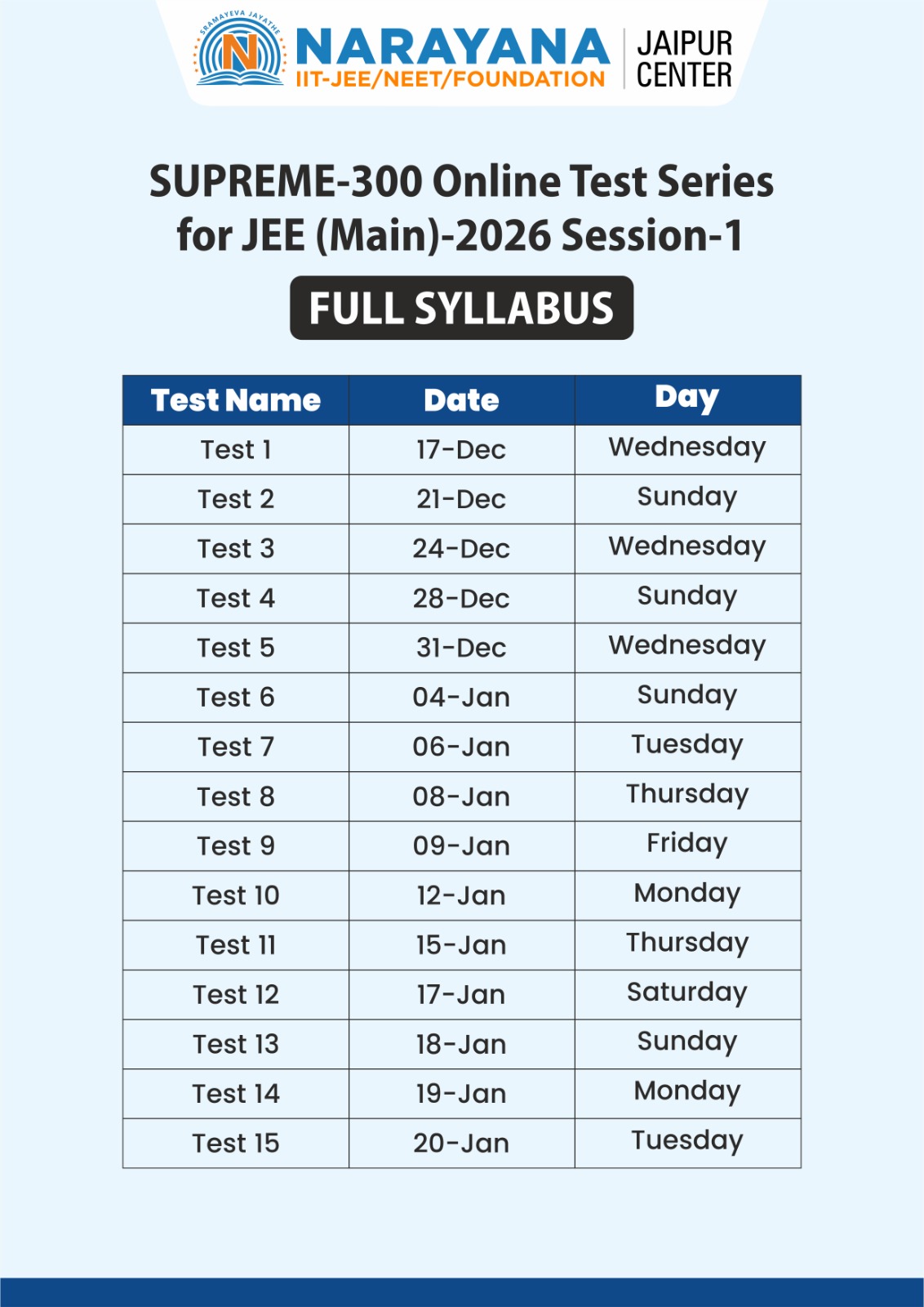 SUPREME-300 is Narayana’s exclusive Online Test Series for JEE Main 2026, meticulously designed for Class 12 appearing and passed students aiming for a perfect 300 score.